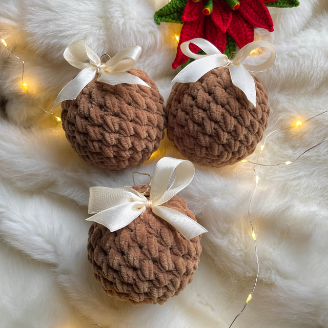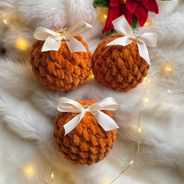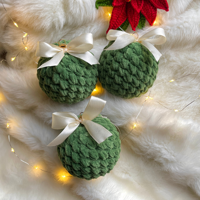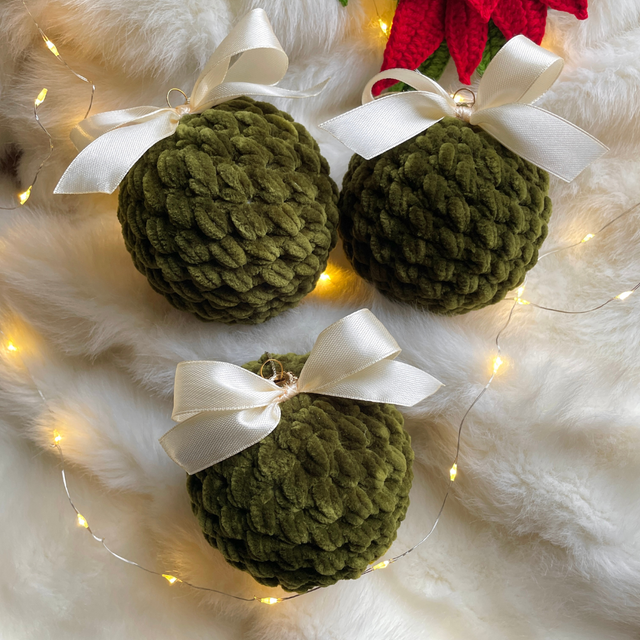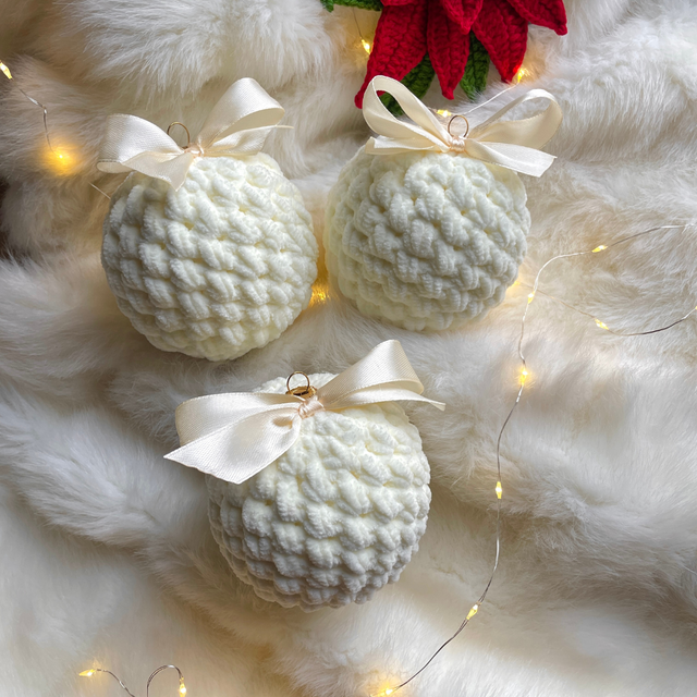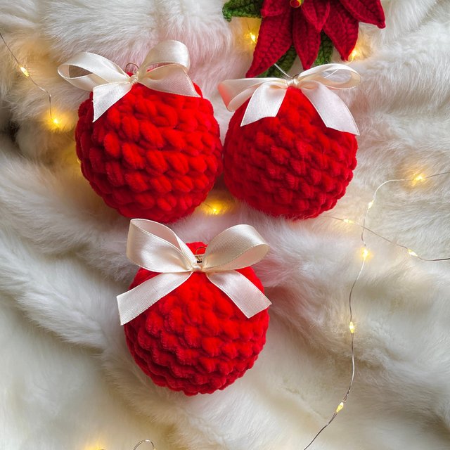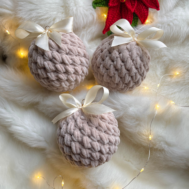 Pluszowa bombka wykonana z miękkiej włóczki szenilowej, na bazie kuli styropianowej o średnicy ok. 8 cm (z włóczką średnica ok 9cm).