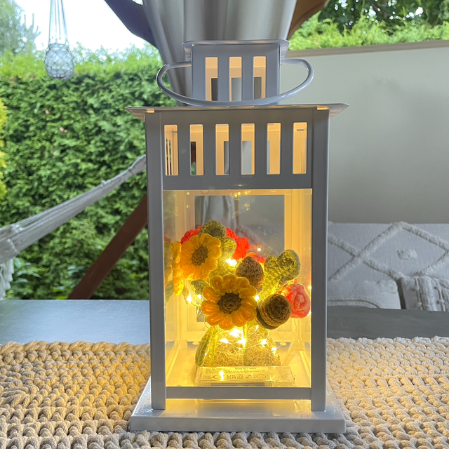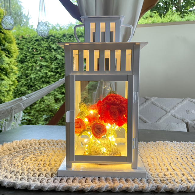 Kwiaty osadzone są na podstawce, dzięki czemu możesz w każdej chwili wyjąć je z lampionu i zastąpić sezonową kompozycją.