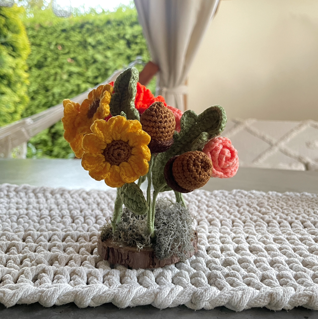 Komplet zawiera: 1 goździk, 5 małych róż, 3 małe słoneczniki, dwa żołędzie, światełka LED, dekoracyjny mech, drewnianą podstawkę i lampion.