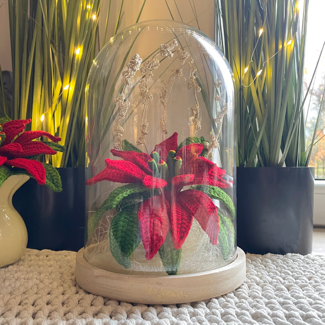 Każdy stroik to małe dzieło sztuki stworzone z sercem. W przezroczystej szklanej kopule kryje się szydełkowa gwiazda betlejemska z akrylowej włóczki, papierowe płatki, dekoracje florystyczne i delikatne światełka LED, które subtelnie rozświetlają całość.